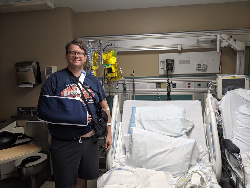 Everyone in trauma was amazing. They begin by checking my neck and spine. Then determining my pelvis and right leg and knee have no breaks. My parents have arrived at this point. My wife's parents arrive just after them. I can feel my ribs shuffling around every time I'm dragged off the bed onto an x-ray or CT scan.