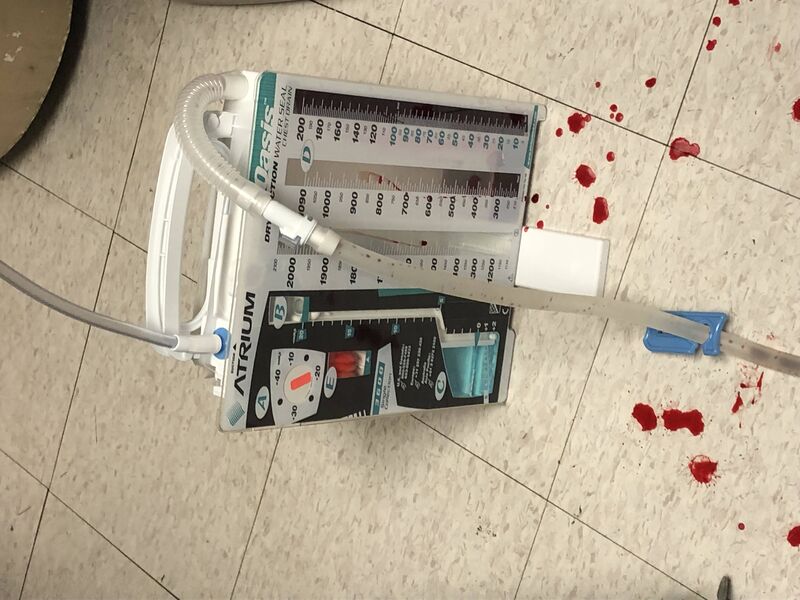 I could hear a small amount of blood splatter on the floor after the last hard push. I thanked the Doctor for putting in the tube. His response was, "I've never been thanked for a chest insertion" This took place around 1am Monday night (Tuesday morning). I was able to get about 3 hours of sleep before waking up for something. X-rays, blood draws, breathing exercises, it was constant for the next few days.
